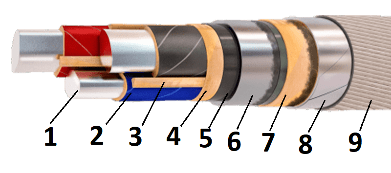 <li>Фазная бумажная изоляция жилы, пропитанная вязким изоляционным составом. Номинальная толщина слоя – 2,75 мм. Жилы отмаркированы в соответствии с ГОСТ 18410-73. Маркировка может быть цветовой и цифровой. Цветовая наносится лентами сплошного цвета или с полосками, отличающимися по цвету.<br>