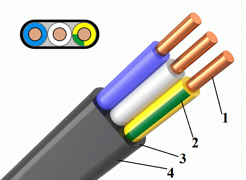 - ВВГнг-П – с медными жилами, с изоляцией и оболочкой из ПВХ пластиката пониженной пожарной опасности, без защитного покрова, не распространяет горение, плоский профиль.
